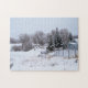 La nieve cubre la cabaña y los pastos de este bonito rancho en Nevada. Diseñado por Diane Blackman. La escena es una imagen clásica de tarjeta de Navidades de invierno.