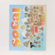Una escena luminosa y colorida ofrece una vista espectacular del sur de California - personajes extravagantes de la playa y el desierto de SoCal mostrando Los Ángeles, San Diego, Condado de Naranja, Santa Bárbara, Riverside, Palm Springs, Anza Borrego y los parques de árboles Joshua Tree, así como las ciudades fronterizas de Tijuana, Tecate y Mexicali. Esta encantadora escena lo tiene todo - un surfista cuelga diez mientras una ballena asesina salta del agua, animales del zoo saludan a los turistas, una pareja de playa muscular flex para impresionar mientras un T-Rex ruge un desafío y un tanque se mueve en posición y mucho más...
