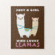 Llamas Adorables decoradas en tradicionales borlos y sillones. El texto dice: "Sólo un Chica que ama las Llamas".