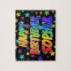 Este emocionante y animado diseño de rompecabezas con temática de cumpleaños muestra el mensaje "FELIZ CUMPLEAÑOS, SOPHIA" con los personajes que tienen un colorido patrón de gradiente inspirado en el espectro de arcoiris, además de un divertido campo de patrones de fondo de estrellas. Un rompecabezas vibrante como este podría ser una manera divertida de reconocer el cumpleaños de alguien llamado Sophia. [~Z0000468]