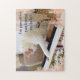 Una adorable fotografía de un gatito blanco y moreno que ensambla un rompecabezas con el mensaje "¡Soy paciente, me has amado la ayuda!"