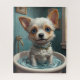 Adorables mascotas sentados en una bañera, con gotitas de agua y burbujas alrededor. El cachorro mira al espectador con ojos anchos e inocentes, y sus pequeñas patas descansan en el borde de la bañera. El conjunto es agradable y humorístico, ideal para un conjunto poster.