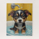 Adorables mascotas sentados en una bañera, con gotitas de agua y burbujas alrededor. El cachorro mira al espectador con ojos anchos e inocentes, y sus pequeñas patas descansan en el borde de la bañera. El conjunto es agradable y humorístico, ideal para un conjunto poster.