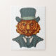 Un tigre vestido con un traje verde azulado y un sombrero de tope pintado con un fondo mudo, dando un aspecto elegante y caprichoso. La expresión seria del animal es enfatizada por el atuendo formal.
