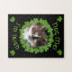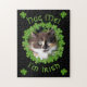 Calico gatito de ojos finos y verdes rodeado de cuatro tréboles de hojas. Abrazame, soy irlandés. Este texto puede ser personalizado en la plantilla proporcionada. Chispas verdes alegres y vibraciones positivas para los amantes de los gatos y puzzles de todas las edades. ¡Disfrútalo! Fotografía original y diseño de Anura Design Studio.