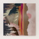 An abstract landscape with unique colors and textures showing a nature landscape with a rising sun and two geese in shades of orange, beige, brown and pink.
