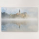 Foto rompecabezas de un amanecer nublado en el lago Bled con un reflejo de la isla con la iglesia en el agua estancada del lago y con el Castillo Bled al fondo en un hermoso día de otoño en Eslovenia.
