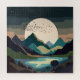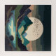 Un paisaje abstracto de una superluna masiva en una escena de un lago montañoso con una bandada de aves en texturas atrevidas y tonos oscuros de tierra de marrón, beige, marrón, azul, cian y negro.