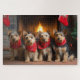 Una escena encantadora capta la esencia de la comodidad y el espíritu de las vacaciones mientras los compañeros peludos adornados en gorras de Santa Claus se reúnen alrededor de una chimenea chocante. La calidez de la chimenea crea un ambiente acogedor para estos adorables caninos, mientras que las medias festivas cuelgan al fondo, lo que crea un ambiente alegre. El encantador ilustracion retrata una imagen atemporal de la compañía y la alegría festiva, perfecta para celebrar la temporada navideña con un toque de encanto canino.