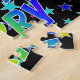 Este vibrante y divertido diseño de rompecabezas con temática de cumpleaños tiene el mensaje "FELIZ CUMPLEAÑOS, TERRY" con los personajes con un colorido patrón de gradiente inspirado en el espectro de arcoiris, junto con un dinámico patrón de fondo de campo estrella. Un acertado rompecabezas como este podría ser usado para enviar saludos de cumpleaños a alguien llamado Terry. [~Z0000468]