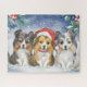 This adorable puzzle features a watercolor painting of three shelties sitting in the snow. The sheltie in the middle is wearing Santa's hat