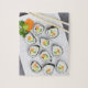 Algunos deliciosos y deliciosos rollos de sushi, comida japonesa. Este es un rompecabezas divertido pero te hará ansiar el sushi.