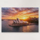 Enjoy a relaxing and rewarding challenge with this stunning jigsaw puzzle featuring a breathtaking aerial view of the iconic Sydney Opera House at sunset. Captured above the beautiful waters of Sydney Harbour in Sydney, Australia, this high-definition photograph highlights the famous sail-shaped architecture glowing in warm golden evening light.