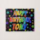 Este diseño de rompecabezas vibrante, divertido, con temática de cumpleaños, tiene el mensaje "FELIZ CUMPLEAÑOS, TONY" con los personajes con un coloreado patrón de gradiente inspirado en el espectro del arcoiris, además de un dinámico patrón de fondo de campo estrella. Un acertado rompecabezas como este podría ser usado para enviar deseos de cumpleaños a alguien llamado Tony. [~Z0000468]
