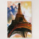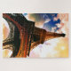 Una foto de la Torre Eiffel en París, Francia, con nubes rosas y amarillas contra un cielo azul y una torre metalizado roja.