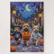 Los adorables Cairn Terriers vestidos con juguetones disfraces de Halloween llevan cubos de calabaza mientras truco o truco bajo el cielo iluminado por la luna. Este diseño festivo destaca el escuálido abrigo de la raza, su animada personalidad y su espíritu aventurero, capturando a la perfección la atmósfera espeluznante y divertida de la noche de Halloween. Una deliciosa celebración para los amantes del perro y los fans de Halloween por igual.