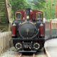 Gales, la tierra de los pequeños trenes de vapor. Un tren rojo muy bien conservado y vagones verdes llenos de pasajeros.