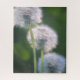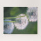 Disfruta juntando las piezas del rompecabezas de la pintura "Esperando por la Brisa", tres flores de león blancas listas para una suave brisa para liberar sus deseos al aire con un fondo de hierba verde.