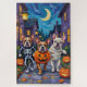 Bulldoges adorables vestidos con juguetones disfraces de Halloween llevan baldes de calabaza mientras truco o truco bajo el cielo iluminado por la luna. Este diseño festivo resalta la robusta construcción de la raza, la cara arrugada y la personalidad adorable, capturando a la perfección la atmósfera espeluznante y divertida de la noche de Halloween. Una deliciosa celebración para los amantes del perro y los fans de Halloween por igual.