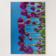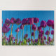 Un divertido y desafiante rompecabezas con tulipanes violetas brillantes contra un cielo de primavera azul