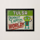 Un encantador rompecabezas de rompecabezas de viaje vintage de Tulsa Oklahoma con un gracioso y amigable robot, junto con un divertido texto de estilo retro que dice: "Nos vemos en Tulsa"