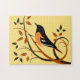 Arte de ave decorativo en rompecabezas de turpial de Baltimore posado en espirales de rama estilizadas con patrón de hoja en color de dos tonos