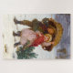 Vintage illustration of a boy and a girl joyfully dragging a holly tree through the winter forest while carrying a basket over their head to protect themselves from the falling snow. Nostalgic oil painting by English artist Frederick Morgan.