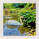 Un cisne sereno se desliza con gracia sobre un estanque tranquilo, rodeado de vegetación exuberante y colchonetas de lirios. Los tonos vivos de las olas verdes y suaves del agua crean un ambiente tranquilo e idílico.