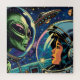 Comic libro de arte pop estilo ai arte que representa a una astronauta que conoce a un extraterrestre que está en el espacio exterior con un OVNI, estrellas y planetas en el fondo.