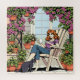 Un divertido ilustracion de historietas de una mujer sentada en su silla de césped en su patio, con su gato, una taza de café o té y rodeada de clematis morados y plantas colgantes.