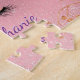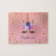 Este rompecabezas personalizado presenta un unicornio con florituras de oro rosa y purpurina plateado. Personalice el texto con un nombre.