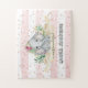 Ilustracion acuático de un adorable elefante bebé. Hermosas flores rosadas rodean a esta criatura animal super salvaje. El fondo está formado por rayas blancas y rosas de color acuático y un purpurina rosa. Celebra el primer cumpleaños de tu hijo con este simple y lindo diseño. El título "señorita Maravillosa" está escrito a mano mientras que el nombre del niño tiene un estilo de letra más infantil (por cierto, el nombre del tipo de letra es "sopa de alfabeto", tan lindo).