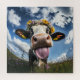 Imagen de una vaca parada en un soleado prado adornada con una vibrante corona floral de margaritas y flores silvestres. La vaca está sacando la lengua, añadiendo un toque de humor y encanto a la escena. El cielo azul intenso y las nubes suaves en el fondo refuerzan aún más el ambiente alegre y caprichoso de la imagen.