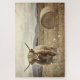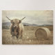Esta obra de arte de creación digital presenta una majestuosa vaca Highland parada en un campo rústico de heno, con un bale de heno redondo cerca, todo representado en un estilo fotográfico vintage. Los suaves tonos sepia y los detalles en textura evocan el encanto de antaño, perfecto para una casa de campo o una decoración de campo.