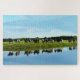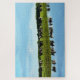 Este rompecabezas tiene una hermosa foto de una línea de vacas lecheras Holstein blancas y negras seguidas en un vibrante pasto verde con un agujero de agua en el primer plano que refleja a las vacas y el brillante cielo azul turbio de Alberta.