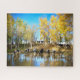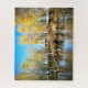 Este rompecabezas de 526 piezas tiene colores brillantes contrastantes en una imagen otoñal de vacas Holstein blancas y negras en el agujero de agua de abajo y en una plataforma de árboles en hojas amarillas, doradas, verdes y naranjas.