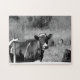 Curiosas vacas lecheras holstein miran a través de la valla desde sus pastos preguntándose qué está haciendo el fotógrafo en este rompecabezas con temática de granja de b&w. Diversión para toda la familia en una tarde de fin de semana perezosa. Disfruten de armar este rompecabezas de diversión familiar que muestra una foto temática de la granja de vacas lecheras en su hábitat natural.