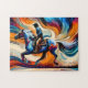 Este moderno diseño abstracto cuenta con un vaquero montando su caballo en un remolino de colores.