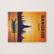 Poster de viajes vintage estilizado que representa el icónico templo Wat Arun en Bangkok, Tailandia, al atardecer con un bote en el río.