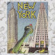 Ilustración antigua de Estados Unidos cartel de viaje o etiqueta de equipaje, Saludos desde Nueva York con los famosos lugares emblemáticos del Empire State Building, Rockefeller Center y la Estatua de la Libertad (Lady Liberty) sosteniendo su antorcha.