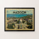 Diseño de Madison Wisconsin en estilo Viaje Vintage con el perfil de la ciudad de Madison, Wisconsin, capital de estado con vistas al lago y cielo azul.