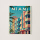 Colorful illustration of iconic Miami architecture featuring geometric patterns, pastel colors, and lush palm fronds casting shadows.