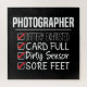 Cita divertida de Photographer-Life. Humor creativo de la lista de comprobación para cómo nos sentimos al final del día: tarjeta llena, batería agotada, sensor sucio y pies desgastados. > Idea de apreciación por un instructor profesional, aficionado o fotógrafo principiante. > Personalizable: agregue su propio nombre o texto personalizado.