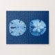Puzzle en un ilustracion de vida marina vintage de un dólar de arena, realzado digitalmente y coloreado en tonos azules y blancos, contra un fondo azul índigo profundo