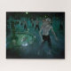 Los zombies deambulan por un parque nebuloso en medio de la noche mientras los esqueletos trepan de una fuente brillante en este rompecabezas con temática de horror.