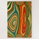 Esta imagen abstracta es un vibrante giro de colores, con una mezcla de verdes, naranjas, rojos, amarillos y marrones. Los patrones recuerdan a fluido, movimiento fluido, creando un efecto orgánico, casi psicodélico. La imagen tiene un aspecto dinámico y giratorio, con formas ovaladas concéntricas y líneas ondulantes que crean un sentido de profundidad y movimiento. Escala de dificultad 1-10: 7