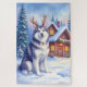 Celebrate the holidays with this adorable watercolor Christmas card featuring a fluffy Alaskan Malamute wearing playful reindeer antlers. Set beside a snowy cabin glowing with colorful lights, this cozy winter scene brings seasonal charm to every mailbox. Ideal for dog lovers, pet parents, and breed enthusiasts, this card’s blank interior makes it easy to personalize with heartfelt holiday greetings. A warm and cheerful way to share festive spirit.