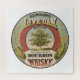 Anuncio de época para la destilería de encino en vivo de Schmidlapp, whisky de borbón de cobre destilado. La imagen muestra una etiqueta de barril de whisky bourbon representando un roble de gran extensión con picos de montaña bajos visibles más allá; marco circular embellecido con un patrón geométrico, grano y orejas de maíz.