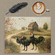 This jigsaw puzzle features a farm and field scene with vintage botanical artwork of White Faced Black Spanish Bantam Roosters and Chicken. The poultry artwork is from a vintage illustration in the public domain, available via the Flickr Commons, and it's placed on a farm journal background with a barn and autumn trees. The White Faced Black Spanish Chicken —often called "Clown Faced Chickens"—are a rare heritage breed available from several major hatcheries and specialty breeders.