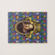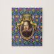 El bardo - en este rompecabezas está un retrato de William Shakespeare autor. El retrato está en un marco oval adornado del oro con las cintas y una corona en el top. El papel pintado azul del fondo se adorna con los castillos, las coronas de los reyes y las flores amarillas y rojas, trayendo para importar del romance, de la tragedia y de la comedia de sus juegos y poesía.